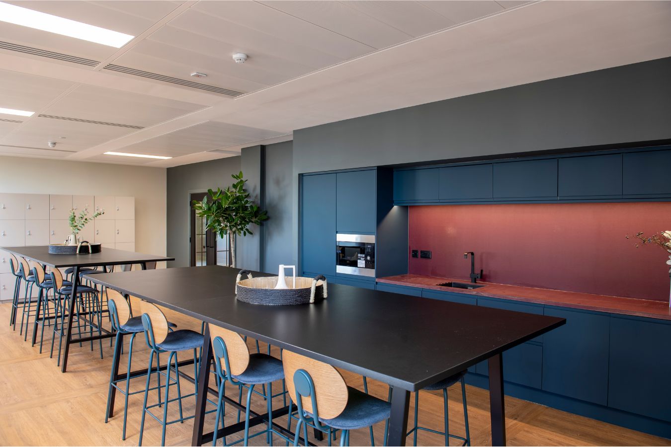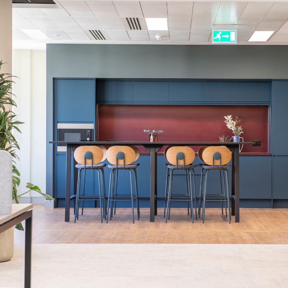 - Statement poseur height stools to add a level of colour and playfulness to the kitchen breakout.