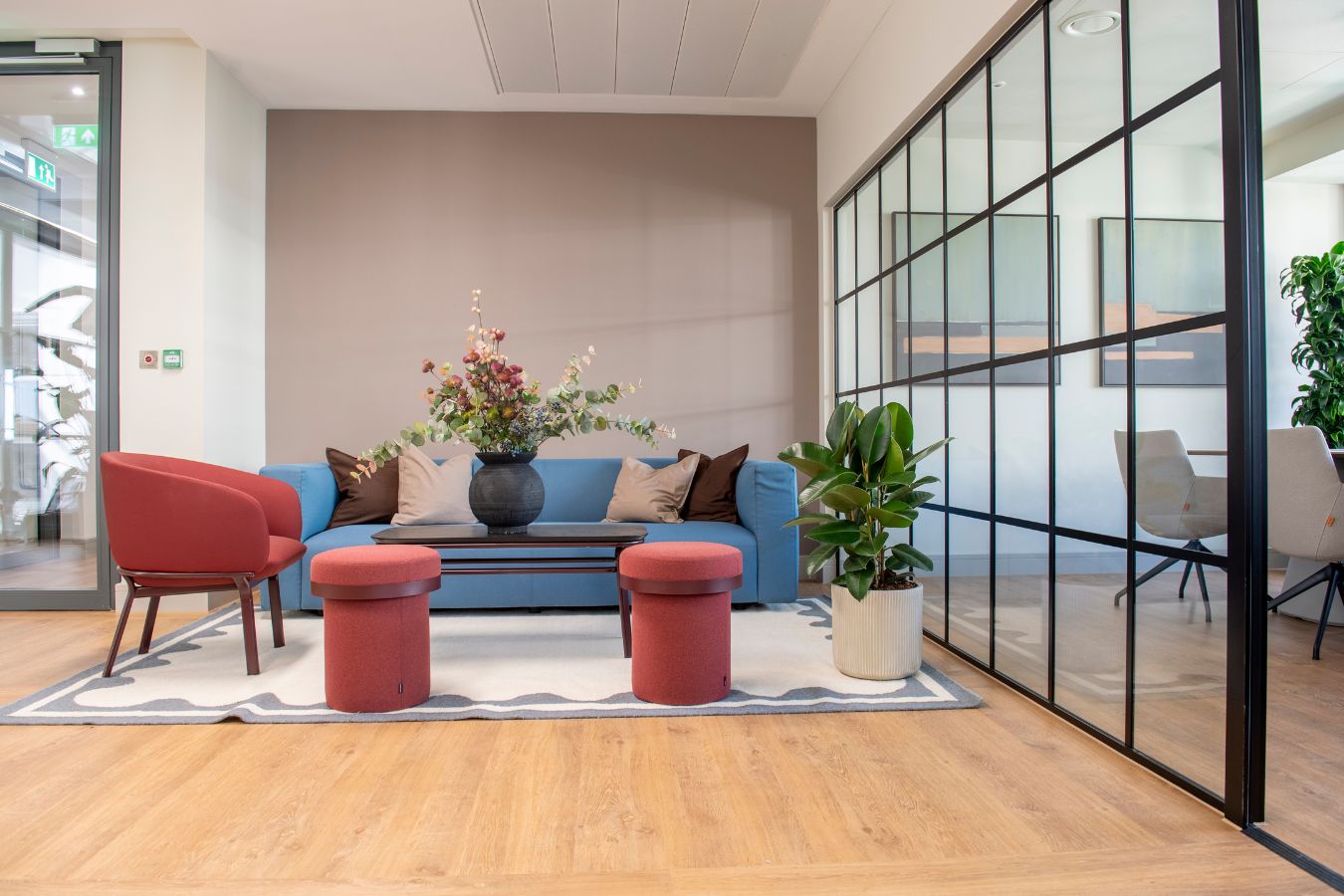 - Neutral finishes throughout the workspace with vibrancy introduced through loose furniture.